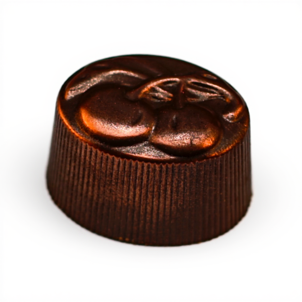 Brandy Cherry combines dark chocolate with Kirsch-soaked cherry pieces and a smooth house-made fondant. The dark shell breaks with a clean snap, revealing a liquid center that mixes sweet, tart, and lightly bitter flavors. The result is balanced and full, with the cherry’s brightness cutting through the richness of the chocolate.